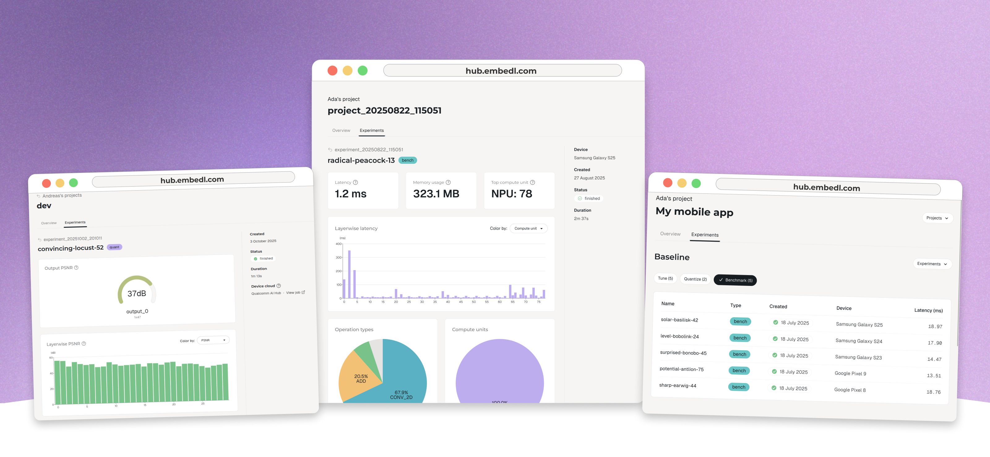 Embedl Hub logs your metrics, parameters, and benchmarks, and presents them in a web UI where you can inspect layer-level behavior, compare devices side by side, and reproduce every run. Our goal with this UI is to make it easy to confidently choose the best model–device combination before releasing your app.